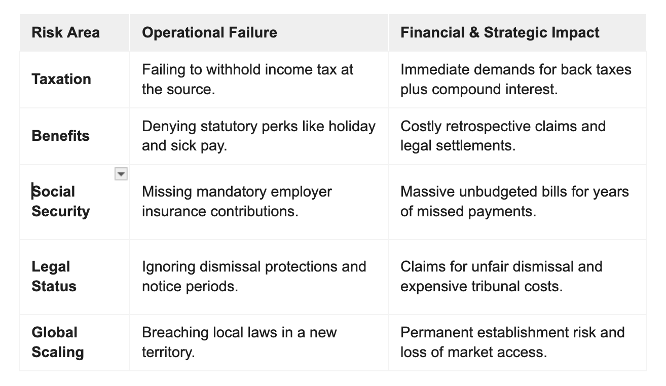 These risks compound rapidly over time and across borders. A single misclassified worker in a remote team can act as a "tripwire," triggering a wider audit that exposes your entire organisation to multi-jurisdictional penalties.